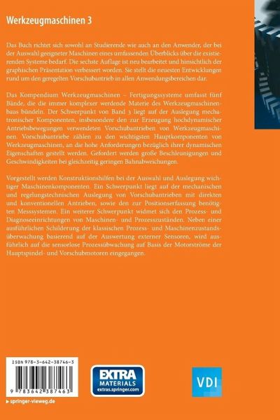 Vorgestellt werden Konstruktionshilfen bei der Auswahl und Auslegung wichtiger Maschinenkomponenten. Ein Schwerpunkt liegt auf der mechanischen und regelungstechnischen Auslegung von Vorschubantrieben mit direkten und konventionellen Antrieben, sowie den zur Positionserfassung benötigten Messsystemen. Ein weiterer Schwerpunkt widmet sich den Prozess- und Diagnoseeinrichtungen von Maschinen- und Prozesszuständen. Neben einer ausführlichen Schilderung der klassischen Prozess- und Maschinenzustandsüberwachung basierend auf der Auswertung externer Sensoren, wird ausführlich auf die sensorlose Prozessübwachung auf Basis der Motorströme der Hauptspindel- und Vorschubmotoren eingegangen.