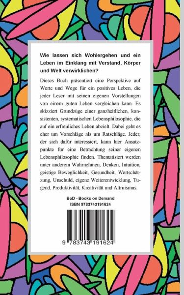 Wie lassen sich Wohlergehen und ein Leben im Einklang mit Verstand, Körper und Welt verwirklichen? Dieses Buch präsentiert eine Perspektive auf Werte und Wege für ein positives Leben, die jeder Leser mit seinen eigenen Vorstellungen von einem guten Leben vergleichen kann. Es skizziert Grundzüge einer ganzheitlichen, konsistenten, systematischen Lebensphilosophie, die auf ein erfreuliches Leben abzielt. Dabei geht es eher um Vorschläge als um Ratschläge. Jeder, der sich dafür interessiert, kann hier Ansatzpunkte für eine Betrachtung seiner eigenen Lebensphilosophie finden. Thematisiert werden unter anderem Wahrnehmen, Denken, Intuition, geistige Beweglichkeit, Gesundheit, Wertschätzung, Unschuld, eigene Weiterentwicklung, Tugend, Produktivität, Kreativität und Altruismus.Neben einer Perspektive auf ein positives Leben, wie sie dieses Buch präsentiert, sind natürlich auch andere Perspektiven auf ein positives Leben möglich. Zum einen unterscheiden wir uns in unseren Vorstellungen davon, was wir positiv finden. Zum anderen haben wir unterschiedliche Vorstellungen davon, wie wir zu einem positiven Leben gelangen können, selbst wenn wir uns einig sind, worin es besteht. Das Buch ist also keine Gesamtdarstellung aller erdenklichen Wertvorstellungen und Wege für ein positives Leben, vielmehr kann die Perspektive in diesem Buch gewohnte Perspektiven ergänzen.Mehr als einzelne kleine Details stehen in diesem Buch ein ganzheitlicher Überblick und ein konsistenter Aufbau im Vordergrund. Der Inhalt besteht daher zum Teil bereits in der umfangreichen systematischen Gliederung. Insgesamt ist das Buch so aufgebaut, dass erst Werte für ein positives Leben und dann Wege für ein positives Leben betrachtet werden. Bei den Wegen geht es der Reihe nach um Einklang mit Verstand, Körper und Welt. Die Inhalte werden dabei zunächst ohne Bezug auf geistesgeschichtliche Protagonisten präsentiert. Im letzten Teil gibt es dann einige Verweise, die Vergleiche mit prominenten Lehren aus der Philosophiegeschichte ermöglichen. Diese Verweise sind aber nicht als flächendeckende Philosophiegeschichte, sondern vielmehr als ergänzende und abrundende Denkanstöße zu sehen.