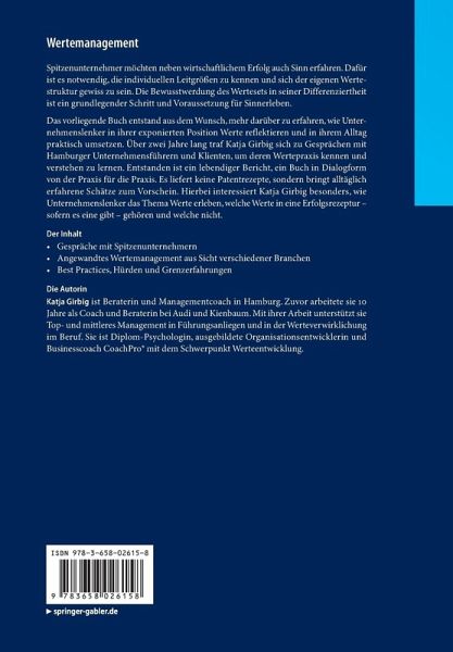 Das vorliegende Buch entstand aus dem Wunsch, mehr darüber zu erfahren, wie Unternehmenslenker in ihrer exponierten Position Werte reflektieren und in ihrem Alltag praktisch umsetzen. Über zwei Jahre lang traf Katja Girbig sich zu Gesprächen mit Hamburger Unternehmensführern und Klienten, um deren Wertepraxis kennen und verstehen zu lernen. Entstanden ist ein lebendiger Bericht, ein Buch in Dialogform von der Praxis für die Praxis. Es liefert keine Patentrezepte, sondern bringt alltäglich erfahrene Schätze zum Vorschein. Hierbei interessiert Katja Girbig besonders, wie Unternehmenslenker das Thema Werte erleben, welche Werte in eine Erfolgsrezeptur - sofern es einegibt - gehören und welche nicht.