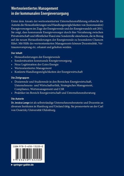 Unter dem Ansatz der werteorientierten Unternehmensfuhrung erforscht die Autorin die Herausforderungen und Handlungsmöglichkeiten von (kommunalen) Energieversorgern im Zuge der Energiewende und des Energiewandels seit 2011. Sie zeigt, dass kommunale Energieversorger durch ihre Verzahnung zwischen Privatwirtschaft und öffentlicher Hand eine Sonderrolle einnehmen, die in Bezug auf die neuen Herausforderungen der Energiewende zu besonderen Chancen führt. Mit Hilfe des werteorientierten Managements können Dezentralität, Vertrauensvorsprung etc. erkannt und gehoben werden.