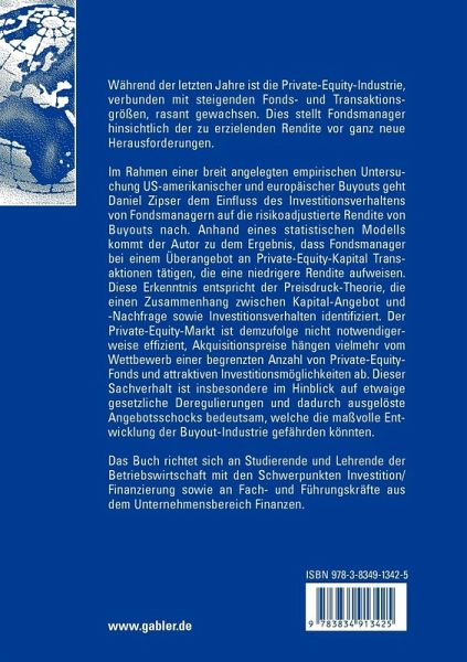 Im Rahmen einer breit angelegten empirischen Untersuchung US-amerikanischer und europäischer Buyouts geht Daniel Zipser dem Einfluss des Investitionsverhaltens von Fondsmanagern auf die risikoadjustierte Rendite von Buyouts nach. Anhand eines statistischen Modells kommt der Autor zu dem Ergebnis, dass Fondsmanager bei einem Überangebot an Private-Equity-Kapital Transaktionen tätigen, die eine niedrigere Rendite aufweisen. Diese Erkenntnis entspricht der Preisdruck-Theorie, die einen Zusammenhang zwischen Kapital-Angebot und -Nachfrage sowie Investitionsverhalten identifiziert. Der Private-Equity-Markt ist demzufolge nicht notwendigerweise effizient, Akquisitionspreise hängen vielmehr vom Wettbewerb einer begrenzten Anzahl von Private-Equity-Fonds und attraktiven Investitionsmöglichkeiten ab. Dieser Sachverhalt ist insbesondere im Hinblick auf etwaige gesetzliche Deregulierungen und dadurch ausgelöste Angebotsschocks bedeutsam, welche die maßvolle Entwicklung der Buyout-Industrie gefährden könnten.