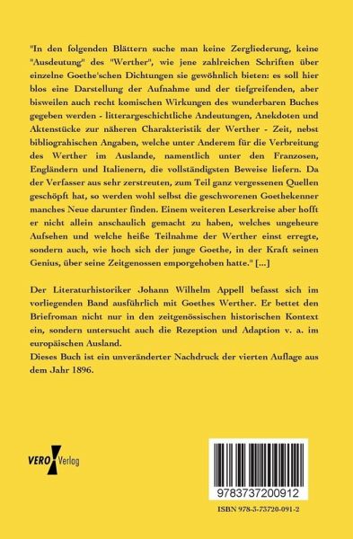 "In den folgenden Blättern suche man keine Zergliederung, keine "Ausdeutung" des "Werther", wie jene zahlreichen Schriften über einzelne Goethe'schen Dichtungen sie gewöhnlich bieten: es soll hier blos eine Darstellung der Aufnahme und der tiefgreifenden, aber bisweilen auch recht komischen Wirkungen des wunderbaren Buches gegeben werden - litterargeschichtliche Andeutungen, Anekdoten und Aktenstücke zur näheren Charakteristik der Werther - Zeit, nebst bibliograhischen Angaben, welche unter Anderem für die Verbreitung des Werther im Auslande, namentlich unter den Franzosen, Engländern und Italienern, die vollständigsten Beweise liefern. Da der Verfasser aus sehr zerstreuten, zum Teil ganz vergessenen Quellen geschöpft hat, so werden wohl selbst die geschworenen Goethekenner manches Neue darunter finden. Einem weiteren Leserkreise aber hofft er nicht allein anschaulich gemacht zu haben, welches ungeheure Aufsehen und welche heiße Teilnahme der Werther einst erregte, sondern auch, wie hoch sich der junge Goethe, in der Kraft seinen Genius, über seine Zeitgenossen emporgehoben hatte." [...]