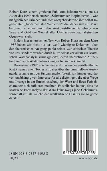 Robert Kurz, einem größeren Publikum bekannt vor allem als Autor des 1999 erschienenen "Schwarzbuch Kapitalismus", war maßgeblicher Urheber und Stichwortgeber der von ihm selbst sogenannten "fundamentalen Wertkritik", die, dabei sich auf Marx berufend, in einer durch den Wert gestifteten Beziehung von Ware und Geld die Wurzel aller Übel unserer kapitalistischen Gegenwart sieht.Die erstmals 1995 erschienene und nun wieder veröffentlichte Kritik seiner ersten ausführlichen Begründung dieser Wertkritik über die unmittelbare Auseinandersetzung mit ihr hinaus und davon unabhängig von Interesse für alle diejenigen, die über Wege und Irrwege in der Entschlüsselung der Ware und ihres Fetischcharakters sich aufklären möchten. Es stellt sich heraus, dass die Marxsche Formanalyse der Ware keineswegs jene Geheimwissenschaft ist, als welche der wertkritische Diskurs sie so gerne darstellt.