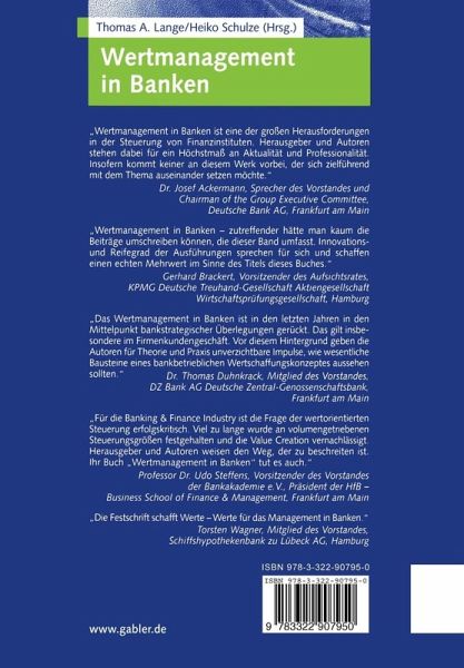 A. Wertmanagement in Unternehmensbereichen.- An den Kundenpotenzialen ausgerichtetes Vertriebs-Controlling.- Wertschaffung durch systematischen Vertrieb am Beispiel der Deutsche Bank Privat- und Geschäftskunden AG.- Wertorientierte Entwicklungsperspektiven im Virtual Banking.- Finanzdienstleistungen für Firmenkunden im Zeichen der Wertorientierung.- Kapitalmarktbasierte Preismodelle für Firmenkundenkredite als Beitrag zur wertorientierten Steuerung in Banken.- Value Management in Investment Banking.- Neue Anforderungen an die Kreditwürdigkeitsprüfung und ihre Bedeutung für das Wertmanagement der Banken.- B. Wertmanagement und Banksteuerung.- Ertragsorientierte Risikokapitalallokation in der Gesamtbanksteuerung.- Basel II - Ein Beitrag zur Wertschaffung in Banken?.- IFRS Rechnungslegung von Banken - Ein Beitrag zur wertorientierten Unternehmenssteuerung.- Wertorientierte Markenführung von Banken.- Herausforderungen einer veränderten Unternehmensumwelt für das Geschäftsmodell einer Bank.- Zur gesellschaftlichen Verantwortung der Finanzindustrie.- Schriftenverzeichnis.