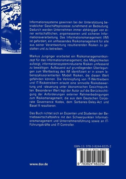 Markus Junginger erarbeitet ein Risikomanagementkonzept für das Informationsmanagement, das Möglichkeiten aufzeigt, informationssysteminduzierte Risiken umfassend zu bewältigen. Aufbauend auf grundlegenden Überlegungen zum Wertbeitrag des IM identifiziert er in einem lebenszyklusorientierten Modell Risiken, die diesen Wert gefährden können. Die Verknüpfung von IT-Werttreibern und IT-Risikotreibern erlaubt eine sinnvolle Risikobewertung und -steuerung unter ökonomischen Gesichtspunkten. Besonderen Wert legt der Autor auf die Berücksichtigung der Anforderungen externer Rahmenbedingungen zum Risikomanagement, die aus dem Deutschen Corporate Governance Kodex, dem Sarbanes-Oxley-Act und Basel II resultieren.