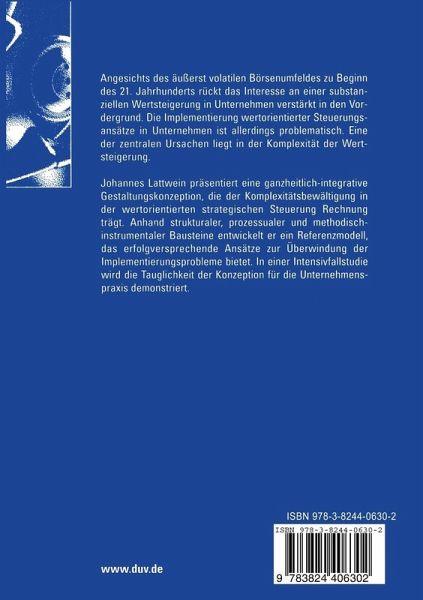 Auf der Basis strukturaler, prozessualer und methodisch-instrumentaler Bausteine entwickelt Johannes Lattwein eine Gestaltungskonzeption zur Implementierung wertorientierter Steuerungsansätze in Unternehmen.