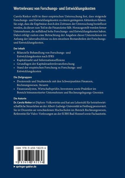 Carola Rinker stellt in ihrer empirischen Untersuchung fest, dass steigende Forschungs- und Entwicklungskosten zu einem geringeren Aktienkurs führen. Sie zeigt, dass die Ergebnisse durch den Zeitraum der Untersuchung beeinflusst werden, da dieser zum Teil in die Finanzkrise fällt. Herausgestellt werden ferner Unternehmen, die auffallend hohe Forschungs- und Entwicklungskosten haben. Dabei erfolgt zudem eine Betrachtung der Angaben dieser Unternehmen im Anhang der Jahresabschlüsse zu den einzelnen Bestandteilen der Forschungs- und Entwicklungskosten.