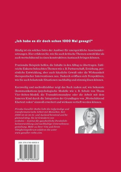 Ich habe es dir doch schon 1000 Mal gesagt!Häufig ist ein solches Intro der Auslöser für unerquickliche Auseinandersetzungen. Hier erfahren Sie, wie Sie auch kritische Themen sowohl klar als auch wertschätzend in einen konstruktiven Austausch bringen können.Praxisnahe Beispiele helfen, die Inhalte in den Alltag zu übertragen. Zahlreiche Exkurse beleuchten Themen wie z. B. Partnerschaft, Erziehung, persönliche Entwicklung, aber auch häusliche Gewalt oder die Wirksamkeit therapeutischer Interventionen neu. Dadurch eröffnen sich Perspektiven, wie Sie auch belastende Situationen nachhaltig und stimmig lösen können. Kurzweilig und nachvollziehbar zeigt das Buch zudem auf, wie bekannte (kommunikations-)psychologische Modelle wie z. B. Schulz von Thuns Vier-Seiten-Modell, die Transaktionsanalyse oder die Arbeit mit dem Inneren Kind durch die Integration der Grundlagen von Wertschätzend Klartext reden sinnvoll erweitert und wirksam vertieft werden können.