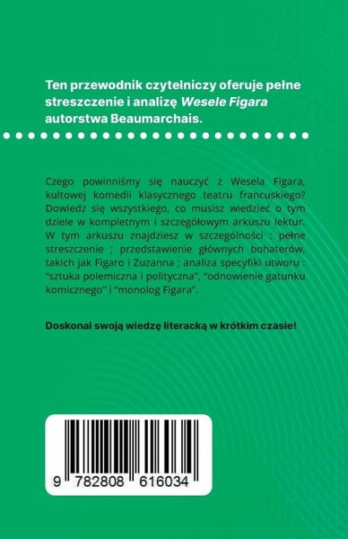 Czego powinni¿my si¿ nauczy¿ z Wesela Figara, kultowej komedii klasycznego teatru francuskiego? Dowiedz si¿ wszystkiego, co musisz wiedzie¿ o tym dziele w kompletnym i szczegó¿owym arkuszu lektur. W tym arkuszu znajdziesz w szczególnöci : - Pe¿ne streszczenie - Przedstawienie g¿ównych bohaterów, takich jak Figaro i Zuzanna - Analiza specyfiki utworu: sztuka polemiczna i polityczna, odnowienie gatunku komicznego i monolog Figara Analiza ¿ród¿owa pozwalaj¿ca szybko zrozumie¿ sens utworu.
