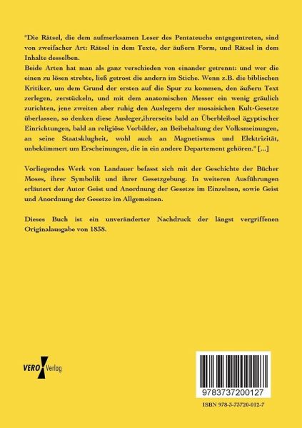 Vorliegendes Werk von Landauer befasst sich mit der Geschichte der Bücher Moses, ihrer Symbolik und ihrer Gesetzgebung. In weiteren Ausführungen erläutert der Autor Geist und Anordnung der Gesetze im Einzelnen, sowie Geist und Anordnung der Gesetze im Allgemeinen.