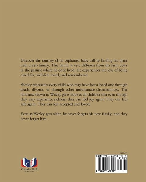 Discover the journey of an orphaned baby calf to finding his place with a new family. This family is very different from the farm cows in the pasture where he once lived. He experiences the joys of being cared for, well-fed, loved, and remembered. Wesley represents every child who may have lost a loved one through death, divorce, or through other unfortunate circumstances. The kindness shown to Wesley gives hope to all children that even though they may experience sadness, they can feel joy again! They can feel safe again. They can feel accepted and loved. Even as Wesley gets older, he never forgets his new family, and they never forget him.