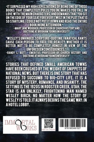 Stories that defined small American towns have been crushed by the weight of snippets of national news. But there is one story that has refused to succumb to big-city life. It is a story of mystery, romance, and insanity. The setting is the 1920s in Rooster Creek, Utah. The star is an unlikely, frightening man named Wesley Birch. No matter how the story of Wesley is told, it always begins the same way: in a hotel lobby. From prolific best-selling authors Susan Easton Black and George Durrant comes this gripping historical mystery.