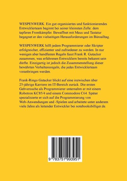 WESPENWERK. Ein gut organisiertes und funktionierendes Entwicklerteam beginnt bei seiner kleinsten Zelle: dem tapferen Frontkämpfer. Bewaffnet mit Maus und Tastatur begegnet er den vielseitigen Herausforderungen im Büroalltag. WESPENWERK hilft jedem Programmierer oder Skripter erfolgreicher, effizienter und zufriedener zu werden. In nur wenigen aber handfesten Regeln fasst Frank R. Gutacker zusammen, was erfahrenen Entwicklern bereits bekannt sein dürfte. Einzigartig ist jedoch die Zusammenstellung dieser bewährten Verhaltensregeln, die jedes Entwicklerteam voranbringen werden.
