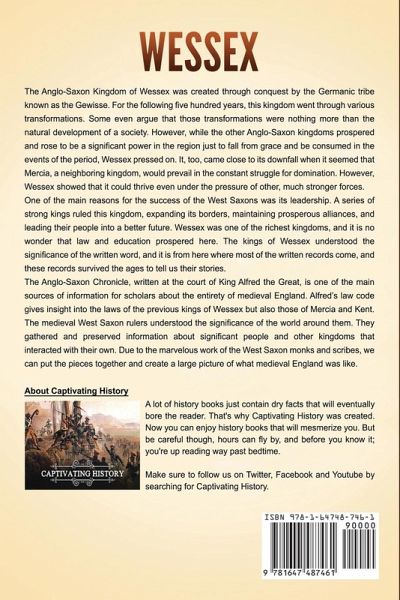 If you want to discover the captivating history of the Wessex, then keep reading... The Anglo-Saxon Kingdom of Wessex was created through conquest by the Germanic tribe known as the Gewisse. For the following five hundred years, this kingdom went through various transformations. Some even argue that those transformations were nothing more than the natural development of a society. However, while the other Anglo-Saxon kingdoms prospered and rose to be a significant power in the region just to fall from grace and be consumed in the events of the period, Wessex pressed on. It, too, came close to its downfall when it seemed that Mercia, a neighboring kingdom, would prevail in the constant struggle for domination. However, Wessex showed that it could thrive even under the pressure of other, much stronger forces. One of the main reasons for the success of the West Saxons was its leadership. A series of strong kings ruled this kingdom, expanding its borders, maintaining prosperous alliances, and leading their people into a better future. Wessex was one of the richest kingdoms, and it is no wonder that law and education prospered here. The kings of Wessex understood the significance of the written word, and it is from here where most of the written records come, and these records survived the ages to tell us their stories. In Wessex: A Captivating Guide to an Anglo-Saxon Kingdom of England and Its Rulers Such as Alfred the Great, Edward the Elder, and Athelstan, you will discover topics such as:The Transitional Period The Creation of the Kingdom of Wessex Caedwalla and Ine Problems in the North The Expansion of West Saxon Power The Royal Brothers Alfred the Great (r. 871-886) The Great Heathen Army Edward the Elder (r. 899-924) Athelstan (r. 924-927 and 927-939) And much, much more! So if you want to learn more about the history of the Wessex, scroll up and click the "add to cart" button!