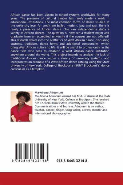 African dance has been absent in school systems worldwide for many years. The presence of cultural dances has rarely made a mark in educational institutions. The most common forms of dance studied at the university level for credit are ballet, modern, jazz and tap. There is rarely a presence of African dance. One can independently study a variety of African dances. The question is, how can a student major and graduate from an accredited university if the courses are not offered? This research delves into the aesthetics of West African dance, discussing customs, traditions, dance forms and additional components, which bring West African culture to life. It will be useful to professionals in the dance field who seek to establish a West African dance institution anywhere around the world. This project intends to analyze the lack of traditional African dance within a variety of university systems, and incorporates an example of a West African dance catalog using the State University of New York, College of Brockport's (SUNY Brockport's) dance curriculum as a template.