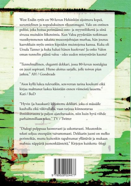 West Endin tytöt on 90-luvun Helsinkiin sijoittuva kepeä, surumielinen ja nopealukuinen rikosromaani. Valo on entinen poliisi, joka hoitaa perimäänsä osto- ja myyntiliikettä ja siinä sivussa muitakin liiketoimia. Kun Valoa pyydetään tutkimaan vuosikymmenen takaista museonjohtajan murhaa, hän joutuu kasvokkain myös omien kipeiden muistojensa kanssa. Kuka oli Ursula Tanner ja kuka halusi hänen kuolevan? Ja onko Valon oman tunnelin päässä valoa - edes uuden miesystävän kautta? Lukijasuosituksia: -Tunnelmallinen, elegantti dekkari, jossa 80-luvun nostalgiaa on juuri sopivasti. Hieno aloitus sarjalle, jolle toivon pian jatkoa. / AH, Goodreads -Aion kyllä lukea tulevatkin, sen verran tarina koukutti eikä kirjaa malttanut laskea käsistään ennen viimeistä lausetta. / Kati, BoD -Hyvin (ja hauskasti) kirjoitettu dekkari, joka ei mässäile kauhulla eikä väkivallalla, vaan tarjoaa kiinnostavaa ihmiskuvausta ja paljon ajateltavaakin, niin kuin hyvä viihde parhaimmillaan tekee. / TV, Twitter -Dialogi pulppuaa luontevasti ja uskottavasti. Muutenkin teksti soljuu eteenpäin vaivattomasti. Dekkarin juoni on melko perinteikäs, mutta kuitenkin tapahtumat yllättävät ja mukaan mahtuu näppäriä juonenkäänteitä. / Kirjojen kuisketta -blogi