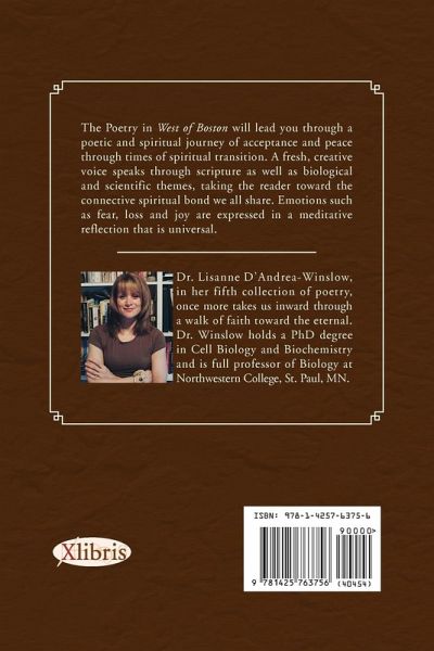 The Poetry in West of Boston will lead you through a poetic and spiritual journey of acceptance and peace through times of spiritual transition. A fresh, creative voice speaks through scripture as well as biological and scientific themes, taking the reader toward the connective spiritual bond we all share. Emotions such as fear, loss and joy are expressed in a meditative reflection that is universal. Dr. Lisanne D'Andrea-Winslow, in her fifth collection of poetry, once more takes us inward through a walk of faith toward the eternal.