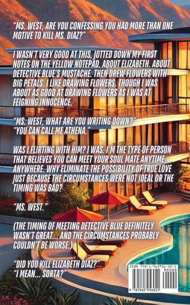 Athena West is West of Love, West of Danger, and WEST OF DEATH ---------------------------------------- A Crazy Cozy Murder Mystery sends a Snarky Sleuth diving into Deadly Drama, Bitter Betrayals, and Fatal Flirtation ---------------------------------------- "Ms. West, are you confessing you had more than one motive to kill Ms. Diaz?" I wasn't very good at this. Jotted down my first notes on the yellow notepad. About Elizabeth. About Detective Blue's mustache. Then drew flowers with big petals. I like drawing flowers. Though I was about as good at drawing flowers as I was at feigning innocence. "Ms. West, what are you writing down?" "You can call me Athena." (Was I flirting with him? I was. I'm the type of person that believes you can meet your soul mate at anytime, anywhere. Why eliminate the possibility of true love just because the circumstances were not ideal or the timing was bad?) "Ms. West." (The timing of meeting Detective Blue definitely wasn't great... and the circumstances probably couldn't be worse.) "Did you kill Elizabeth Diaz?" "I mean... sorta?"