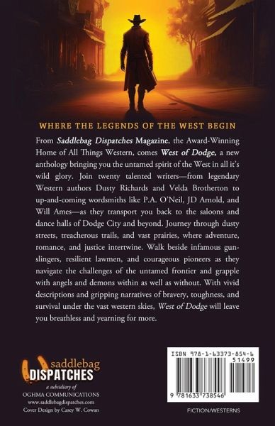 From Saddlebag Dispatches Magazine, the Award-Winning Home of All Things Western, comes West of Dodge, a new anthology bringing you the untamed spirit of the West in all it's wild glory. Join twenty talented writers-from legendary Western authors Dusty Richards and Velda Brotherton to up-and-coming wordsmiths like P.A. O'Neil, JD Arnold, and Will Ames-as they transport you back to the saloons and dance halls of Dodge City and beyond. Journey through dusty streets, treacherous trails, and vast prairies, where adventure, romance, and justice intertwine. Walk beside infamous gunslingers, resilient lawmen, and courageous pioneers as they navigate the challenges of the untamed frontier and grapple with angels and demons within as well as without. With vivid descriptions and gripping narratives of bravery, toughness, and survival under the vast western skies, West of Dodge will leave you breathless and yearning for more.