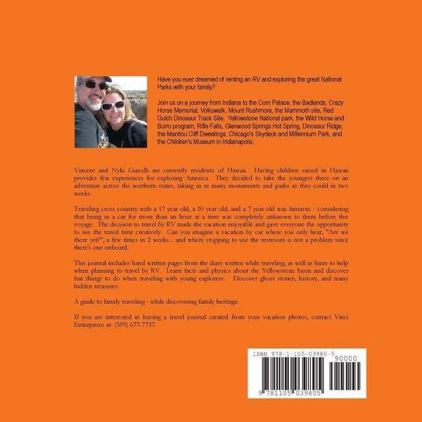 Travel across America in an RV with a teenager, 2 pre-teens, a couple, and the kids grandmother. Traveling by RV proved to be less expensive than getting hotels, and it made the vacation very enjoyable. In fact, the RV gave everyone the opportunity to use the travel time creatively. Can you imagine a vacation by car where you only hear, "Are we there yet?", a few times in 2 weeks... and where stopping to use the restroom is not a problem since there's one on board. This travel journal includes hand written pages from the diary written while traveling, as well as hints to help when planning to travel by RV. Learn facts and physics about the Yellowstone basin and discover fun things to do when traveling with young explorers. Discover ghost stories, history, and many hidden treasures. A guide to family traveling - while discovering family heritage. If you are interested in having a travel journal created from your vacation photos, contact Vinci Enterprises at (559) 677-7737.