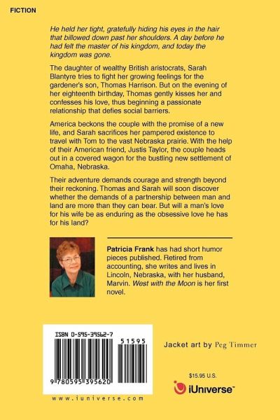 He held her tight, gratefully hiding his eyes in the hair that billowed down past her shoulders. A day before he had felt the master of his kingdom, and today the kingdom was gone. The daughter of wealthy British aristocrats, Sarah Blantyre tries to fight her growing feelings for the gardener's son, Thomas Harrison. But on the evening of her eighteenth birthday, Thomas gently kisses her and confesses his love, thus beginning a passionate relationship that defies social barriers. America beckons the couple with the promise of a new life, and Sarah sacrifices her pampered existence to travel with Tom to the vast Nebraska prairie. With the help of their American friend, Justis Taylor, the couple heads out in a covered wagon for the bustling new settlement of Omaha, Nebraska. Their adventure demands courage and strength beyond their reckoning. Thomas and Sarah will soon discover whether the demands of a partnership between man and land are more than they can bear. But will a man's love for his wife be as enduring as the obsessive love he has for his land?