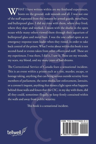 What I have written within are my firsthand experiences, boots on the ground, stab wounds and all. I was not one of the staff separated from the inmates by armed guards, metal bars, and bulletproof glass. I did my time with them, where they lived, where they slept and worked. I swam with the sharks in the open ocean while many others viewed them through their aquarium of bulletproof glass and metal bars. I was the one called upon as an emergency response team leader when they rioted, in order to take back control of the prison. What I write about within this book is not second-hand or events taken from other officers and staff. These are my experiences. I was there, I did it, I saw it. These are my wounds, my scars, my blood, and my many years of bad dreams. The Correctional Service of Canada fears a sensational incident. This is an event within a prison such as a riot, murder, escape, or hostage taking, anything that can bring serious outside scrutiny from members of parliament, the news media, law enforcement, lawsuits, or a coroner's inquest, anything that shines a light upon what happens behind those walls and fences that the CSC, in my day with them, did all they could, sometimes illegally, to keep firmly contained within the walls and away from public scrutiny. This book is a sensational incident.