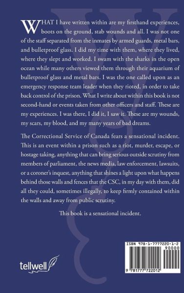 What I have written within are my firsthand experiences, boots on the ground, stab wounds and all. I was not one of the staff separated from the inmates by armed guards, metal bars, and bulletproof glass. I did my time with them, where they lived, where they slept and worked. I swam with the sharks in the open ocean while many others viewed them through their aquarium of bulletproof glass and metal bars. I was the one called upon as an emergency response team leader when they rioted, in order to take back control of the prison. What I write about within this book is not second-hand or events taken from other officers and staff. These are my experiences. I was there, I did it, I saw it. These are my wounds, my scars, my blood, and my many years of bad dreams. The Correctional Service of Canada fears a sensational incident. This is an event within a prison such as a riot, murder, escape, or hostage taking, anything that can bring serious outside scrutiny from members of parliament, the news media, law enforcement, lawsuits, or a coroner's inquest, anything that shines a light upon what happens behind those walls and fences that the CSC, in my day with them, did all they could, sometimes illegally, to keep firmly contained within the walls and away from public scrutiny. This book is a sensational incident.
