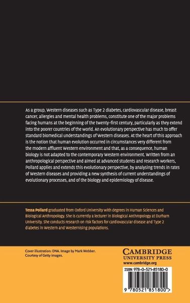 As a group, western diseases such as type 2 diabetes, cardiovascular disease, breast cancer, allergies and mental health problems constitute one of the major problems facing humans at the beginning of the 21st century, particularly as they extend into poorer countries. An evolutionary perspective has much to offer standard biomedical understandings of western diseases. At the heart of this approach is the notion that human evolution occurred in circumstances very different from the modern affluent western environment and that, as a consequence, human biology is not adapted to the contemporary western environment. Written with an anthropological perspective and aimed at advanced undergraduates and graduates taking courses in the ecology and evolution of disease, Tessa Pollard applies and extends this evolutionary perspective by analysing trends in rates of western diseases and providing a new synthesis of current understandings of evolutionary processes, and of the biology and epidemiology of disease.