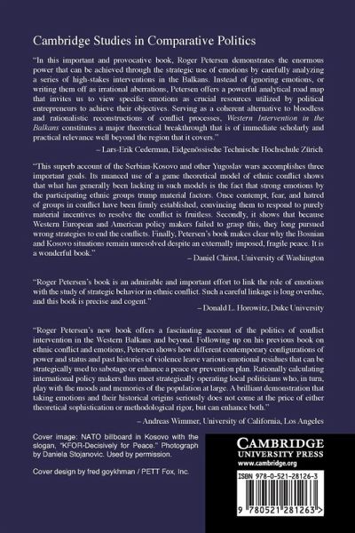 "In this important and provocative book, Roger Petersen demonstrates the enormous power that can be achieved through the strategic use of emotions, by carefully analyzing a series of high-stakes interventions in the Balkans. Instead of ignoring emotions, or writing them off as irrational aberrations, Petersen offers a powerful analytical road map that invites us to view specific emotions as crucial resources utilized by political entrepreneurs to achieve their objectives. Serving as a coherent alternative to bloodless and rationalistic reconstructions of conflict processes, Western Intervention in the Balkans constitutes a major theoretical breakthrough that is of immediate scholarly and practical relevance well beyond the region that it covers."