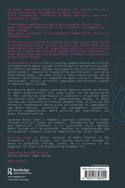 Western Media Systems offers a critical introduction to media systems in North America and Western Europe. The book offers a wide-ranging survey of comparative media analysis addressing the economic, social, political, regulatory and cultural aspects of Western media systems. Jonathan Hardy takes a thematic approach, guiding the reader through critical issues and debates, introducing key concepts and specialist literature. Western Media Systems is essential reading for undergraduate and postgraduate students studying comparative and global media.