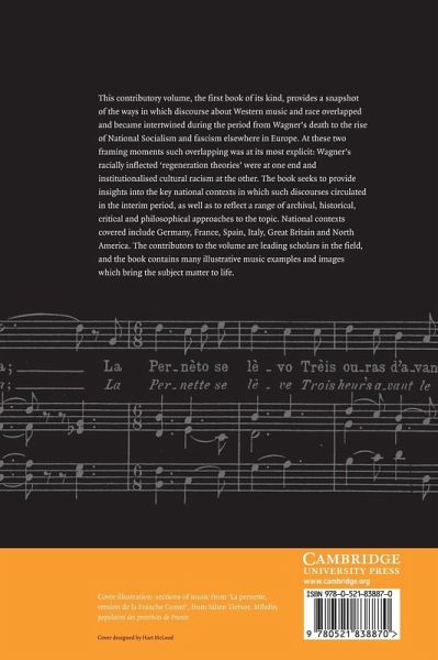 This contributory volume, the first book of its kind, provides a snapshot of the ways in which discourse about Western music and race overlapped and became intertwined during the period from Wagner's death to the rise of National Socialism and fascism elsewhere in Europe. At these two framing moments such overlapping was at its most explicit: Wagner's racially inflected 'regeneration theories' were at one end and institutionalised cultural racism at the other. The book seeks to provide insights into the key national contexts in which such discourses circulated in the interim period, as well as to reflect a range of archival, historical, critical, and philosophical approaches to the topic. National contexts covered include Germay, France, Spain, Italy, Great Britain and North America. The contributors to the volume are leading scholars in the field, and the book contains many illustrative music examples and images which bring the subject matter to life.
