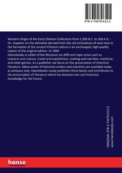 Western Origin of the Early Chinese Civilisation from 2,300 B.C. to 200 A.D. - Or, chapters on the elements derived from the old civilisations of west Asia in the formation of the ancient Chinese culture is an unchanged, high-quality reprint of the original edition of 1894.