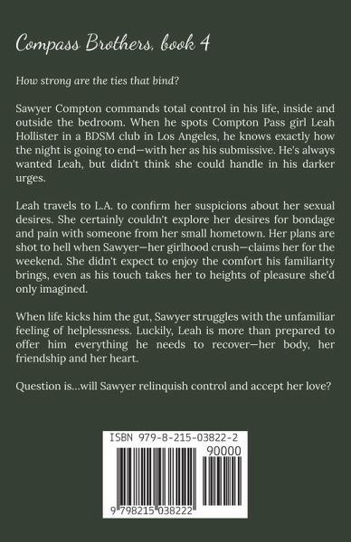 How strong are the ties that bind? Compass Brothers, book 4 Sawyer Compton commands total control in his life, inside and outside the bedroom. When he spots Compton Pass girl Leah Hollister in a BDSM club in Los Angeles, he knows exactly how the night is going to end--with her as his submissive. He's always wanted Leah, but didn't think she could handle in his darker urges. Leah travels to L.A. to confirm her suspicions about her sexual desires. She certainly couldn't explore her desires for bondage and pain with someone from her small hometown. Her plans are shot to hell when Sawyer--her girlhood crush--claims her for the weekend. She didn't expect to enjoy the comfort his familiarity brings, even as his touch takes her to heights of pleasure she'd only imagined. When life kicks him the gut, Sawyer struggles with the unfamiliar feeling of helplessness. Luckily, Leah is more than prepared to offer him everything he needs to recover--her body, her friendship and her heart. Question is...will Sawyer relinquish control and accept her love?