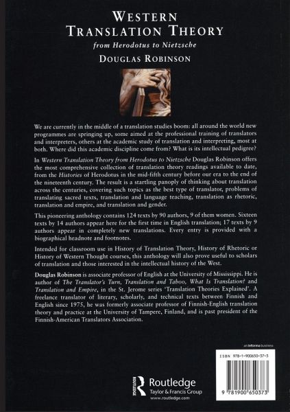 Douglas Robinson offers the most comprehensive collection of translation theory readings available to date, from the Histories of Herodotus in the mid-fifth century before our era to the end of the nineteenth century. The result is a startling panoply of thinking about translation across the centuries, covering such topics as the best type of translator, problems of translating sacred texts, translation and language teaching, translation as rhetoric, translation and empire, and translation and gender.