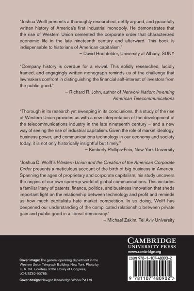 This work chronicles the rise of Western Union Telegraph from its origins in the helter-skelter ferment of antebellum capitalism to its apogee as the first corporation to monopolize an industry on a national scale. The battles that raged over Western Union's monopoly on nineteenth-century American telecommunications - in Congress, in courts, and in the press - illuminate the fierce tensions over the rising power of corporations after the Civil War and the reshaping of American political economy. The telegraph debate reveals that what we understand as the normative relationship between private capital and public interest is the product of a historical process that was neither inevitable nor uncontested. Western Union's monopoly was not the result of market logic or a managerial revolution, but the conscious creation of entrepreneurs protecting their investments. In the process, these entrepreneurs elevated economic liberalism above traditional republican principles of public interest and helped create a new corporate order.