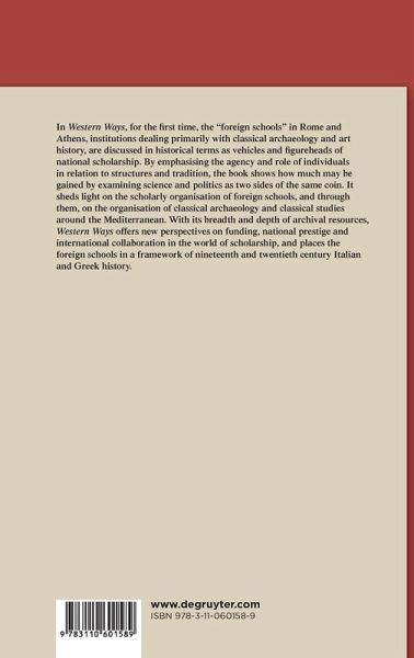 In Western Ways, for the first time, the "foreign schools" in Rome and Athens, institutions dealing primarily with classical archaeology and art history, are discussed in historical terms as vehicles and figureheads of national scholarship. By emphasising the agency and role of individuals in relation to structures and tradition, the book shows how much may be gained by examining science and politics as two sides of the same coin. It sheds light on the scholarly organisation of foreign schools, and through them, on the organisation of classical archaeology and classical studies around the Mediterranean. With its breadth and depth of archival resources, Western Ways offers new perspectives on funding, national prestige and international collaboration in the world of scholarship, and places the foreign schools in a framework of nineteenth and twentieth century Italian and Greek history.