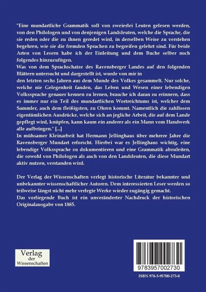 In mühsamer Kleinarbeit hat Hermann Jellinghaus über mehrere Jahre die Ravensberger Mundart erforscht. Hierbei war es Jellinghaus wichtig, eine lebendige Volkssprache zu dokumentieren und eine Grammatik abzuleiten, die sowohl von Philologen als auch von den Landsleuten, die diese Mundart aktiv nutzen, verstanden wird.
