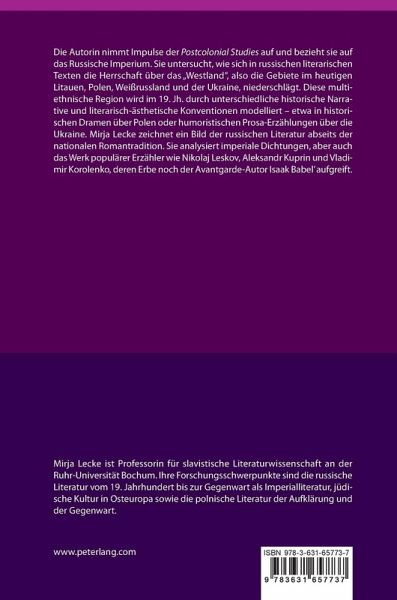 Die Autorin nimmt Impulse der Postcolonial Studies auf und bezieht sie auf das Russische Imperium. Sie untersucht, wie sich in russischen literarischen Texten die Herrschaft über das «Westland», also die Gebiete im heutigen Litauen, Polen, Weißrussland und der Ukraine, niederschlägt. Diese multi-ethnische Region wird im 19. Jh. durch unterschiedliche historische Narrative und literarisch-ästhetische Konventionen modelliert - etwa in historischen Dramen über Polen oder humoristischen Prosa-Erzählungen über die Ukraine. Mirja Lecke zeichnet ein Bild der russischen Literatur abseits der nationalen Romantradition. Sie analysiert imperiale Dichtungen, aber auch das Werk populärer Erzähler wie Nikolaj Leskov, Aleksandr Kuprin und Vladimir Korolenko, deren Erbe noch der Avantgarde-Autor Isaak Babel' aufgreift.
