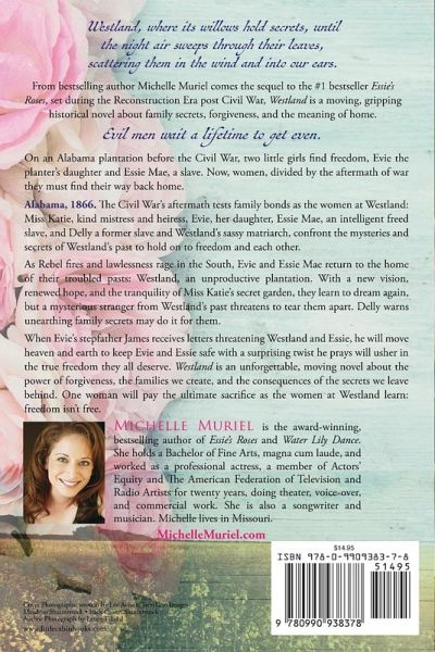 From bestselling author Michelle Muriel comes the sequel to the #1 bestseller Essie's Roses, set during the Reconstruction Era post Civil War, Westland is a moving, gripping historical novel about family secrets, forgiveness, and the meaning of home. Evil men wait a lifetime to get even. On an Alabama plantation before the Civil War, two little girls find freedom, Evie the planter's daughter and Essie Mae, a slave. Now, women, divided by the aftermath of war they must find their way back home. Alabama, 1866. The Civil War's aftermath tests family bonds as the women at Westland: Miss Katie, kind mistress and heiress, Evie, her daughter, Essie Mae, an intelligent freed slave, and Delly a former slave and Westland's sassy matriarch, confront the mysteries and secrets of Westland's past to hold on to freedom and each other. As Rebel fires and lawlessness rage in the South, Evie and Essie Mae return to the home of their troubled pasts: Westland, an unproductive plantation. With a new vision, renewed hope, and the tranquility of Miss Katie's secret garden, they learn to dream again, but a mysterious stranger from Westland's past threatens to tear them apart. Delly warns unearthing family secrets may do it for them. When Evie's stepfather James receives letters threatening Westland and Essie, he will move heaven and earth to keep Evie and Essie safe with a surprising twist he prays will usher in the true freedom they all deserve. Westland is an unforgettable, moving novel about the power of forgiveness, the families we create, and the consequences of the secrets we leave behind. One woman will pay the ultimate sacrifice as the women at Westland learn: freedom isn't free.