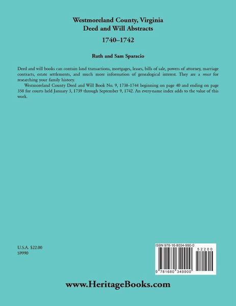 Deed and will books can contain land transactions, mortgages, leases, bills of sale, powers of attorney, marriage contracts, estate settlements, and much more information of genealogical interest. They are a must for researching your family history. Westmoreland County Deed and Will Book No. 9, 1738-1744 beginning on page 40 and ending on page 358 for courts held January 3, 1739 through September 9, 1742. An every-name index adds to the value of this work.