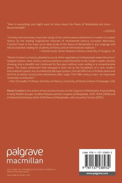 'Derek Croxton's scholarly, detailed account of the negotiations in Westphalia makes the actors' tangled motives, aims, tactics and assumptions comprehensible to the modern reader, thereby showing why a dreadful war continued for five years without even ending in a comprehensive peace. The peace settlement that emerged is seen not as the foundation of a new, modern international system, but as a distinctly Baroque product, the last effort at a Christian peace and the first of similar inconclusive settlements after major 17th-18th century wars - an important revisionist contribution.' - Paul Schroeder, Professor Emeritus of History, University of Illinois Urbana-Champaign, USA
