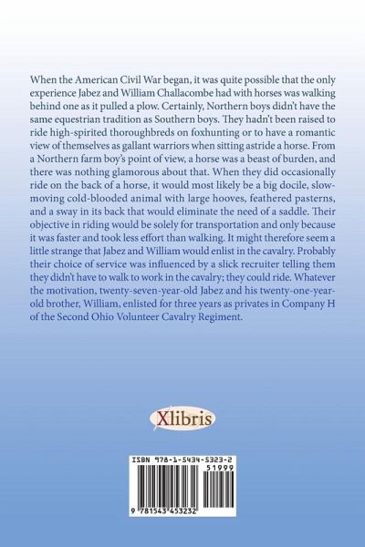 When the American Civil War began, it was quite possible that the only experience Jabez and William Challacombe had with horses was walking behind one as it pulled a plow. Certainly, Northern boys didn’t have the same equestrian tradition as Southern boys. They hadn’t been raised to ride high-spirited thoroughbreds on foxhunting or to have a romantic view of themselves as gallant warriors when sitting astride a horse. From a Northern farm boy’s point of view, a horse was a beast of burden, and there was nothing glamorous about that. When they did occasionally ride on the back of a horse, it would most likely be a big docile, slow-moving cold-blooded animal with large hooves, feathered pasterns, and a sway in its back that would eliminate the need of a saddle. Their objective in riding would be solely for transportation and only because it was faster and took less effort than walking. It might therefore seem a little strange that Jabez and William would enlist in the cavalry. Probably their choice of service was influenced by a slick recruiter telling them they didn’t have to walk to work in the cavalry; they could ride. Whatever the motivation, twenty-seven-year-old Jabez and his twenty-one-year-old brother, William, enlisted for three years as privates in Company H of the Second Ohio Volunteer Cavalry Regiment.