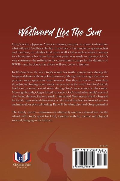 Greg Sonoda, a Japanese American attorney, embarks on a quest to determine what influence God has in his life. In the back of his mind is the question, first and foremost, of whether God exists at all. God is such an elusive concept to a humanist, who, from his earliest years, was made to question God's very existence-he suffered in the concentration camps for the duration of WWII-and he doubts his efforts will ever come to fruition. In Westward Lies the Sun, Greg's search for truth is given voice during the frequent debates with his poker foursome, although the late-night discussions produce more questions than answers. But they do serve to articulate thoughts and feelings about sundry issues such as the search for Greg's family heirloom: a samurai sword stolen during Greg's incarceration in the camps. More significantly, Greg is forced to ponder God's hand in his family's survival after being shipwrecked on a small, uninhabited Micronesian island. Greg and his family make several discoveries on the island that lead to financial success and miraculous physical healing. But will the island also heal Greg spiritually? The family sword-Onimaru-is ultimately used in a showdown on the island with Greg's quest for God, together with his mental and physical survival, hanging in the balance.