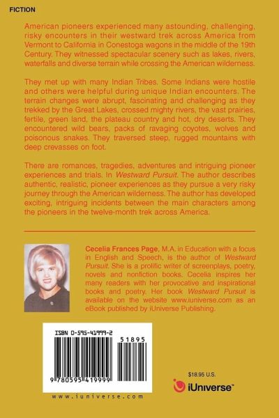 American pioneers experienced many astounding, challenging, risky encounters in their westward trek across America from Vermont to California in Conestoga wagons in the middle of the 19th Century. They witnessed spectacular scenery such as lakes, rivers, waterfalls and diverse terrain in crossing the American wilderness. They met up with many Indian Tribes. Some Indians were hostile and others were helpful during unique Indian encounters. The terrain changes were abrupt, fascinating and challenging as they trekked by the Great Lakes, crossed might rivers, the vast prairies, fertile, green land, the arid plateau country and hot, dry deserts. They encountered wild bears, packs of ravaging coyotes, wolves and poisonous snakes. They traversed steep, rugged mountains with deep crevasses on foot. There are romances, tragedies, adventures and intriguing pioneer experiences and trials. In Westward Pursuit the author describes authentic, realistic, pioneer experiences as they pursue a very risky journey through the American wilderness. The author has developed exciting, intriguing incidents between the main characters among the pioneers in the twelve-month trek across America.