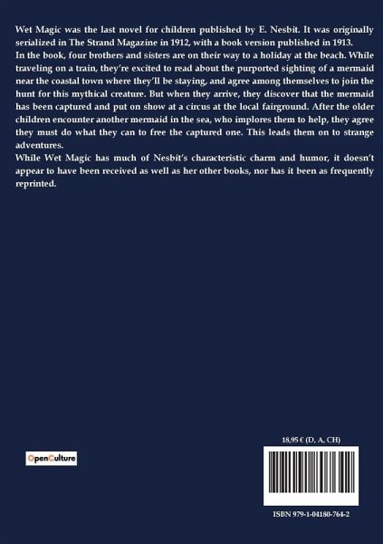 Wet Magic was the last novel for children published by E. Nesbit. It was originally serialized in The Strand Magazine in 1912, with a book version published in 1913. In the book, four brothers and sisters are on their way to a holiday at the beach. While traveling on a train, they¿re excited to read about the purported sighting of a mermaid near the coastal town where they¿ll be staying, and agree among themselves to join the hunt for this mythical creature. But when they arrive, they discover that the mermaid has been captured and put on show at a circus at the local fairground. After the older children encounter another mermaid in the sea, who implores them to help, they agree they must do what they can to free the captured one. This leads them on to strange adventures. While Wet Magic has much of Nesbit¿s characteristic charm and humor, it doesn¿t appear to have been received as well as her other books, nor has it been as frequently reprinted.