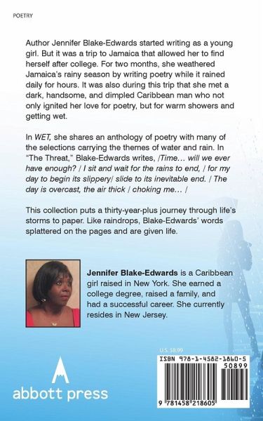 Author Jennifer Blake-Edwards started writing as a young girl. But it was a trip to Jamaica that allowed her to find herself after college. For two months, she weathered Jamaica's rainy season by writing poetry while it rained daily for hours. It was also during this trip that she met a dark, handsome, and dimpled Caribbean man who not only ignited her love for poetry, but for warm showers and getting wet. In WET, she shares an anthology of poetry with many of the selections carrying the themes of water and rain. In "The Threat," Blake-Edwards writes, /Time… will we ever have enough? / I sit and wait for the rains to end, / for my day to begin its slippery/ slide to its inevitable end. / The day is overcast, the air thick / choking me… / This collection puts a thirty-year-plus journey through life's storms to paper. Like raindrops, Blake-Edwards' words splattered on the pages and are given life.