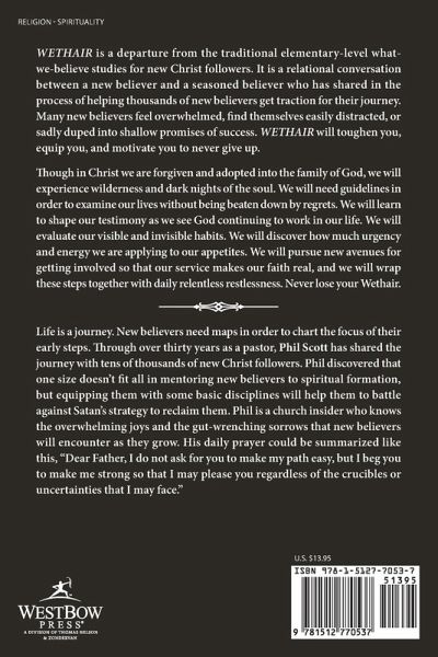 WETHAIR is a departure from the traditional elementary-level what-we-believe studies for new Christ followers. It is a relational conversation between a new believer and a seasoned believer who has shared in the process of helping thousands of new believers get traction for their journey. Many new believers feel overwhelmed, find themselves easily distracted, or sadly duped into shallow promises of success. WETHAIR will toughen you, equip you, and motivate you to never give up. Though in Christ we are forgiven and adopted into the family of God, we will experience wilderness and dark nights of the soul. We will need guidelines in order to examine our lives without being beaten down by regrets. We will learn to shape our testimony as we see God continuing to work in our life. We will evaluate our visible and invisible habits. We will discover how much urgency and energy we are applying to our appetites. We will pursue new avenues for getting involved so that our service makes our faith real, and we will wrap these steps together with daily relentless restlessness. Never lose your Wethair.