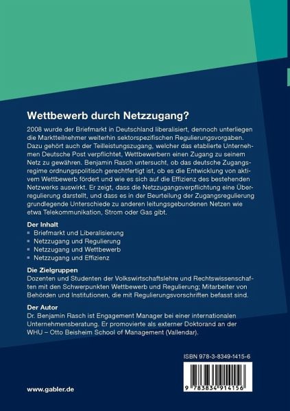 2008 wurde der Briefmarkt in Deutschland liberalisiert, dennoch unterliegen die Marktteilnehmer weiterhin sektorspezifischen Regulierungsvorgaben. Dazu gehört auch der Teilleistungszugang, welcher das etablierte Unternehmen Deutsche Post verpflichtet, Wettbewerbern einen Zugang zu seinem Netz zu gewähren. Benjamin Rasch untersucht, ob das deutsche Zugangsregime ordnungspolitisch gerechtfertigt ist, ob es die Entwicklung von aktivem Wettbewerb fördert und wie es sich auf die Effizienz des bestehenden Netzwerks auswirkt. Er zeigt, dass die Netzzugangsverpflichtung eine Überregulierung darstellt, und dass es in der Beurteilung der Zugangsregulierung grundlegende Unterschiede zu anderen leitungsgebundenen Netzen wie etwa Telekommunikation, Strom oder Gas gibt.