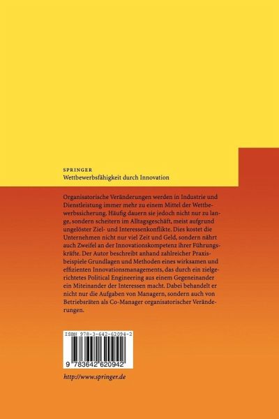 Organisatorische Veränderungen werden in Industrie und Dienstleistung immer mehr zu einem Mittel der Wettbewerbssicherung. Häufig dauern sie jedoch nicht nur zu lange, sondern scheitern im Alltagsgeschäft, meist aufgrund ungelöster Ziel- und Interessenkonflikte. Dies kostet die Unternehmen nicht nur viel Zeit und Geld, sondern nährt auch Zweifel an der Innovationskompetenz ihrer Führungskräfte. Der Autor beschreibt anhand zahlreicher Praxisbeispiele Grundlagen und Methoden eines wirksamen und effizienten Innovationsmanagements, das durch ein zielgerichtetes Political Engineering aus einem Gegeneinander ein Miteinander der Interessen macht. Dabei behandelt er nicht nur die Aufgaben von Managern, sondern auch von Betriebsräten als Co-Manager organisatorischer Veränderungen.