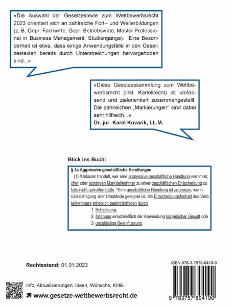 Die aktuelle Ausgabe für das Jahr 2023 liegt ab sofort vor. Die unkommentierten Gesetzestexte "Wettbewerbsrecht 2023" enthält zahlreiche relevante Gesetzestexte aus dem Wettbewerbsrecht (Rechtsstand: 01.01.2023), die auch optimal auf die Anforderungen im Rahmen einer Fort- bzw. Weiterbildung (z. B. Gepr. Fachwirte wie etwa Gepr. Wirtschaftsfachwirte, Gepr. Fachwirte für Marketing, Gepr. Technische Betriebswirte, Gepr. Betriebswirte, Master Professional in Business Management sowie betriebswirtschaftliche Studiengänge oder Seminare) abgestimmt sind.Es enthält - vollständig oder in Auszügen - das Wettbewerbsrecht 2023 aus:Kartellrecht:» Gesetz gegen Wettbewerbsbeschränkungen (GWB)» Vertrag über die Arbeitsweise der Europäischen Union (AEUV)» Vertikal-GVO - Verordnung (EU) 2022/720» EG-Fusionskontrollverordnung - Verordnung (EG) Nr. 139/2004Recht des fairen Wettbewerbs:» Gesetz gegen den unlauteren Wettbewerb (UWG)» P2B-Verordnung - Verordnung (EG) Nr. 2019/1150» Unterlassungsklagengesetz (UKlaG)» Telemediengesetz (TMG)» Telekommunikationsgesetz (TKG)» Telekommunikation-Telemedien-Datenschutz-Gesetz (TTDSG)» TK-Transparenzverordnung (TKTransparenzV)» Medienstaatsvertrag (MStV)» Tabakerzeugnisgesetz (TabakerzG)» Jugendschutzgesetz (JuSchG)» Jugendmedienschutz-Staatsvertrag (JMSt)» Markengesetz (MarkenG)» Health-Claims-Verordnung - Verordnung (EG) Nr. 1924/2006» Preisangabenverordnung (PAngV)Eine Besonderheit ist z. B., dass häufige Anwendungsfälle in den Gesetzestexten bereits durch Unterstreichungen hervorgehoben sind. Weitere Informationen zu dieser Gesetzessammlung unter www.gesetze-wettbewerbsrecht.de(HINWEIS: Bitte beachten Sie den Rechtsstand 2023. Wenn eine aktuelle Ausgabe benötigt wird, verwenden Sie die Ausgabe aus dem aktuellen Jahr.)